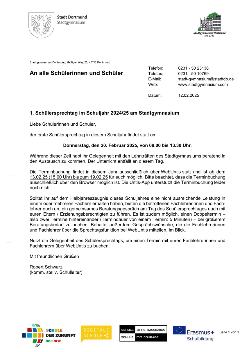 Schülersprechtag am 20.02.25 von it @ STG - Mittwoch, 12. Februar 2025, 18:19 Anzahl Antworten: 0 Liebe Schülerinnen und Schüler, bitte nehmt die folgenden Infos zum Schülersprechtag am 20.02.25 zur Kenntnis: https://stgdo.com/moodle/pluginfile.php/25/mod_forum/post/10453/Sch%C3%BClerinformationsschreiben%20zum%20Sch%C3%BClersprechtag%202025.pdf Dauerlink